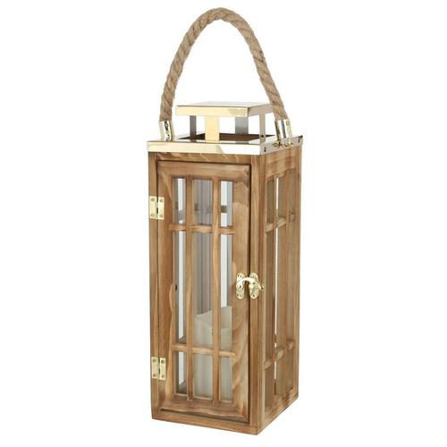 This handsome lantern features glass panels metal hardware and a rope handle.